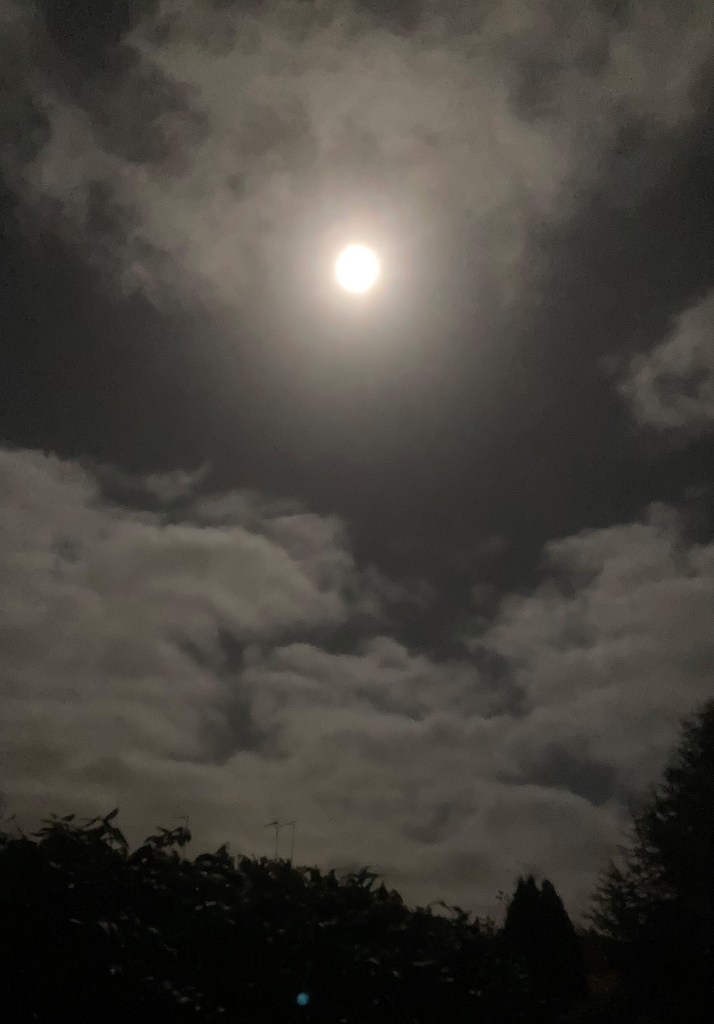 The moon is shining through the night,